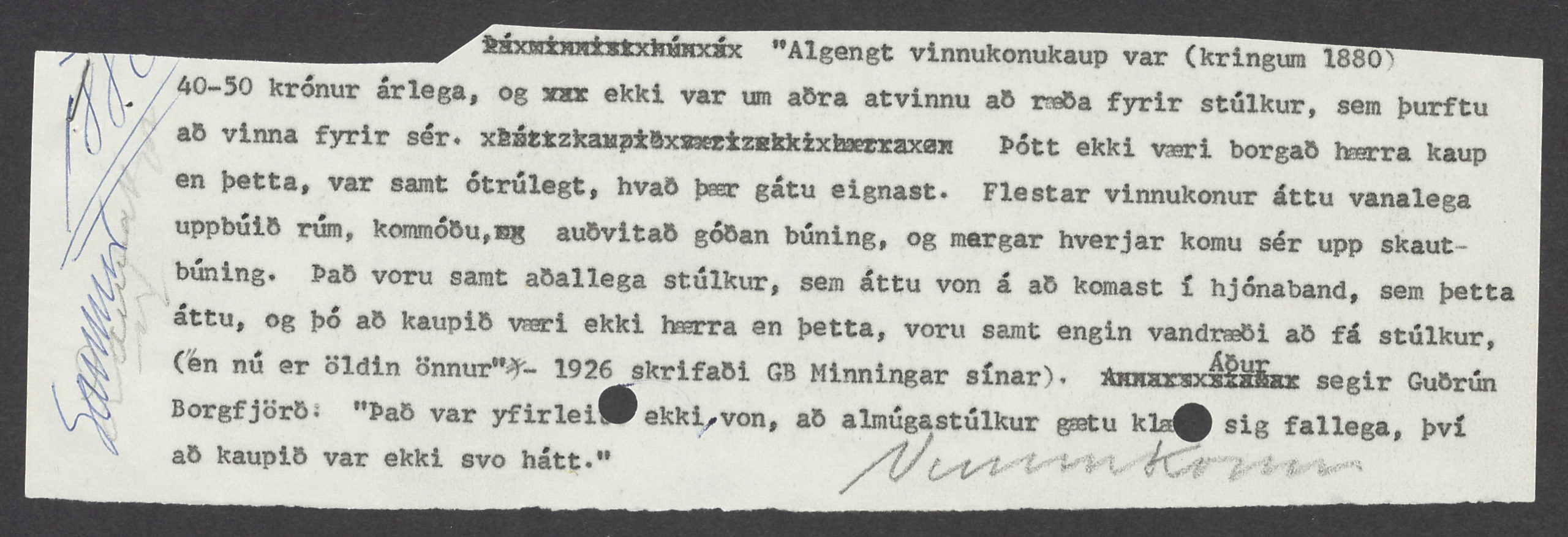 Sigurborg Magnúsdóttir was born on the farm Eyri in Seyðisfjörður in Ísafjarðardjúp, in the Icelandic Westfjords. She had a placement at Snæfjallaströnd as a young woman and later moved to Hafnarfjörður and there married a fisherman. The couple had nine children together and Sigurborg had one prior son, that she lost at only one year old. Sigurborg and her husband divorced in the forties and she moved to Reykjavík. There she lived in straitened conditions and her life was marked by poverty, homelessness and alcoholism. In addition to being a laborer, Sigurborg wrote poetry and plays and was a member of the Kvæðamannafélag Reykjavíkur Poet’s Society. Her poetry frequently revolved around motherhood and her plight as a poor female laborer.