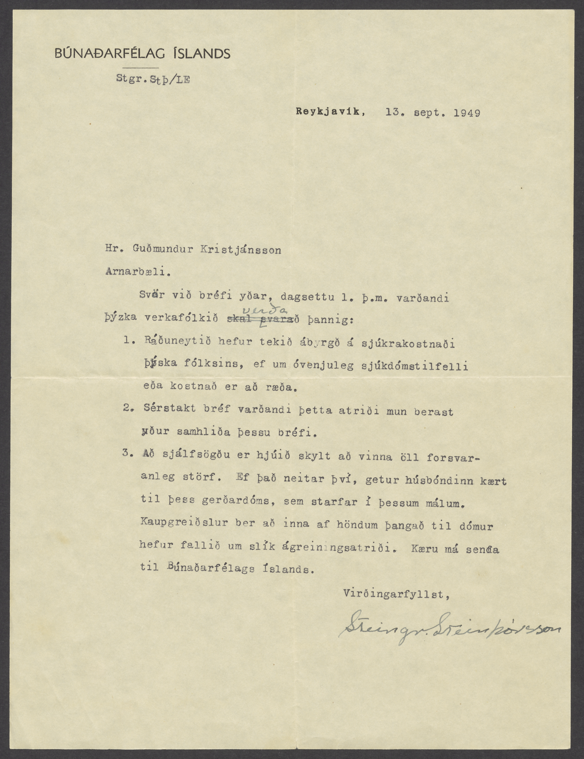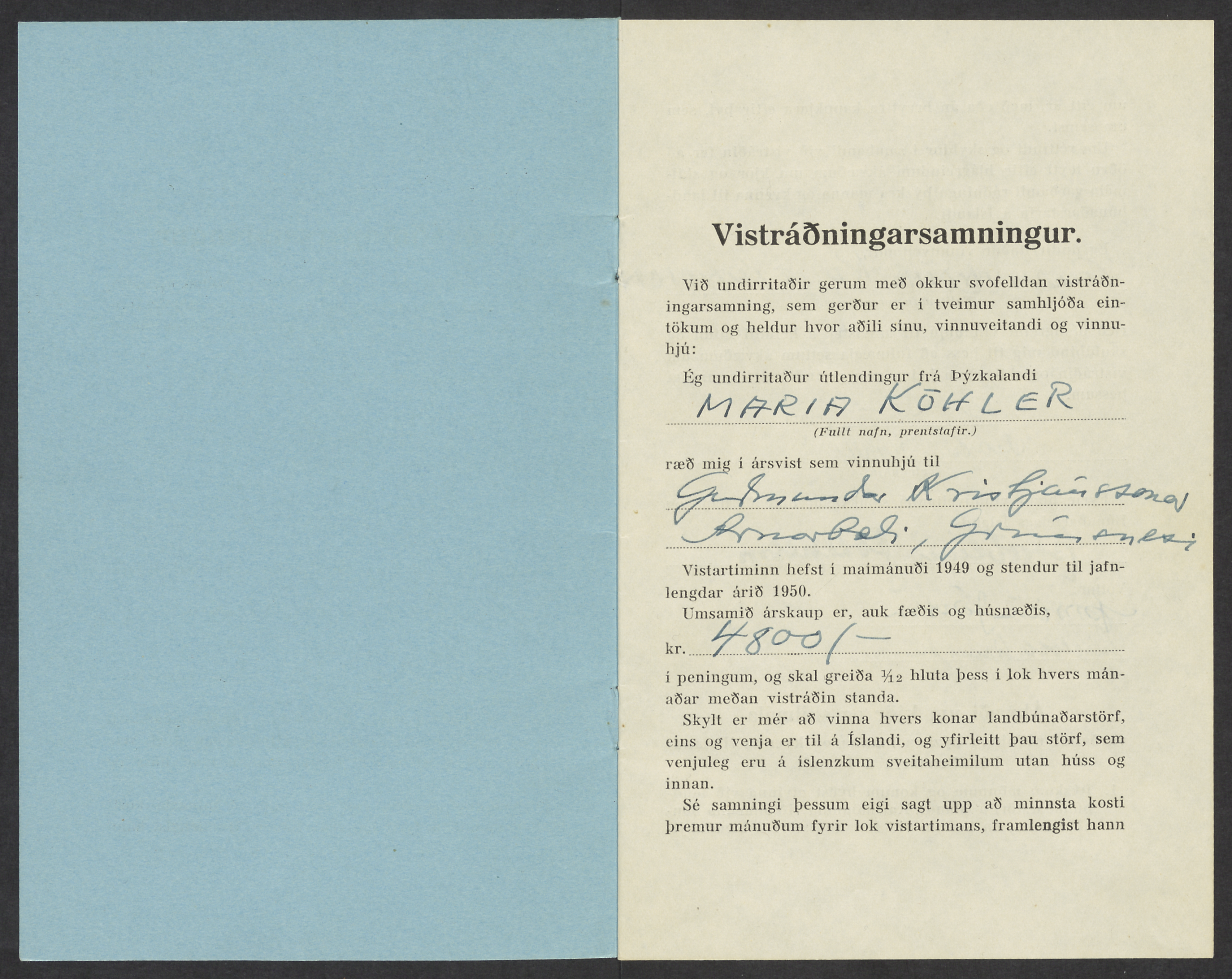 Maria Köhler was hired to work at the farm Arnarbæli in Grímsnes the summer of 1949. She was one of the many German women that came to Iceland after the second world war to work on Icelandic farms, as the situation in post-war Germany was dire and there was a shortage of farm laborers in Iceland. In 1949, of the 314 German farm laborers came to the country through the Búnaðarfélag Íslands Farmer Association, most were women. Many Germans stayed in Iceland but that was probably not the case with María. There are no Icelandic records of her apart from the letters between the Farmer Association and the farmer at Arnarbæli Guðmundur Kristjánsson, about hiring her, but those letters can be found in the archive of his wife, Sigríður Árnadóttir. Kvennasögusafn still has very few documents of women of foreign origin in the archives.