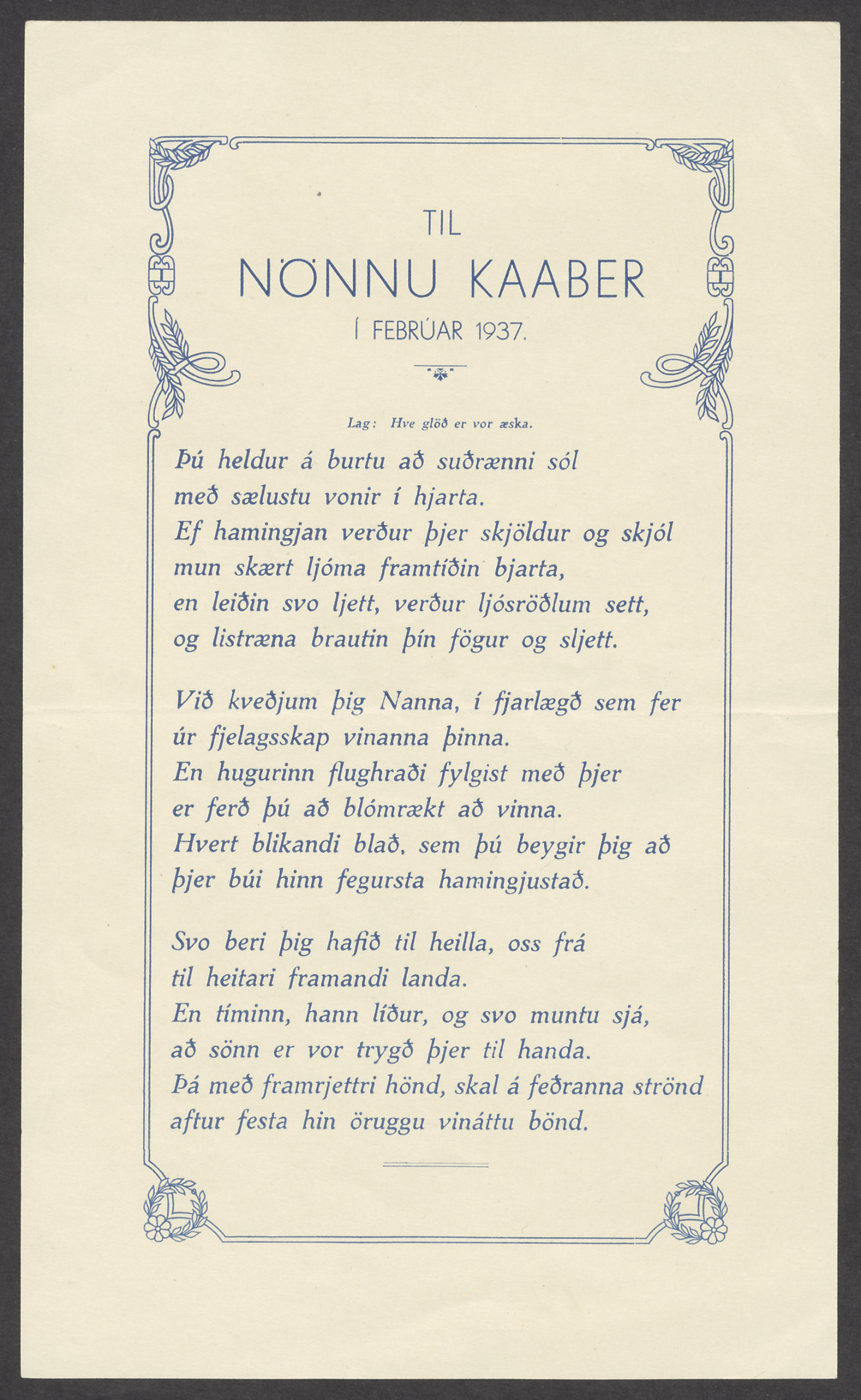 Nanna Kaaber was born in Reykjavík. She studied horticulture and floristry in both Iceland and Denmark and established the flower shop Garður by Garðarstræti with her coworker. She later worked for three decades for the Danish Embassy in Iceland. She was one of the founders of the Útivist travel foundation in 1975 and was a long term guide for the association. She was, amongst others, an active participant in building the Útivist association lodgings in Básar in Þórsmörk.