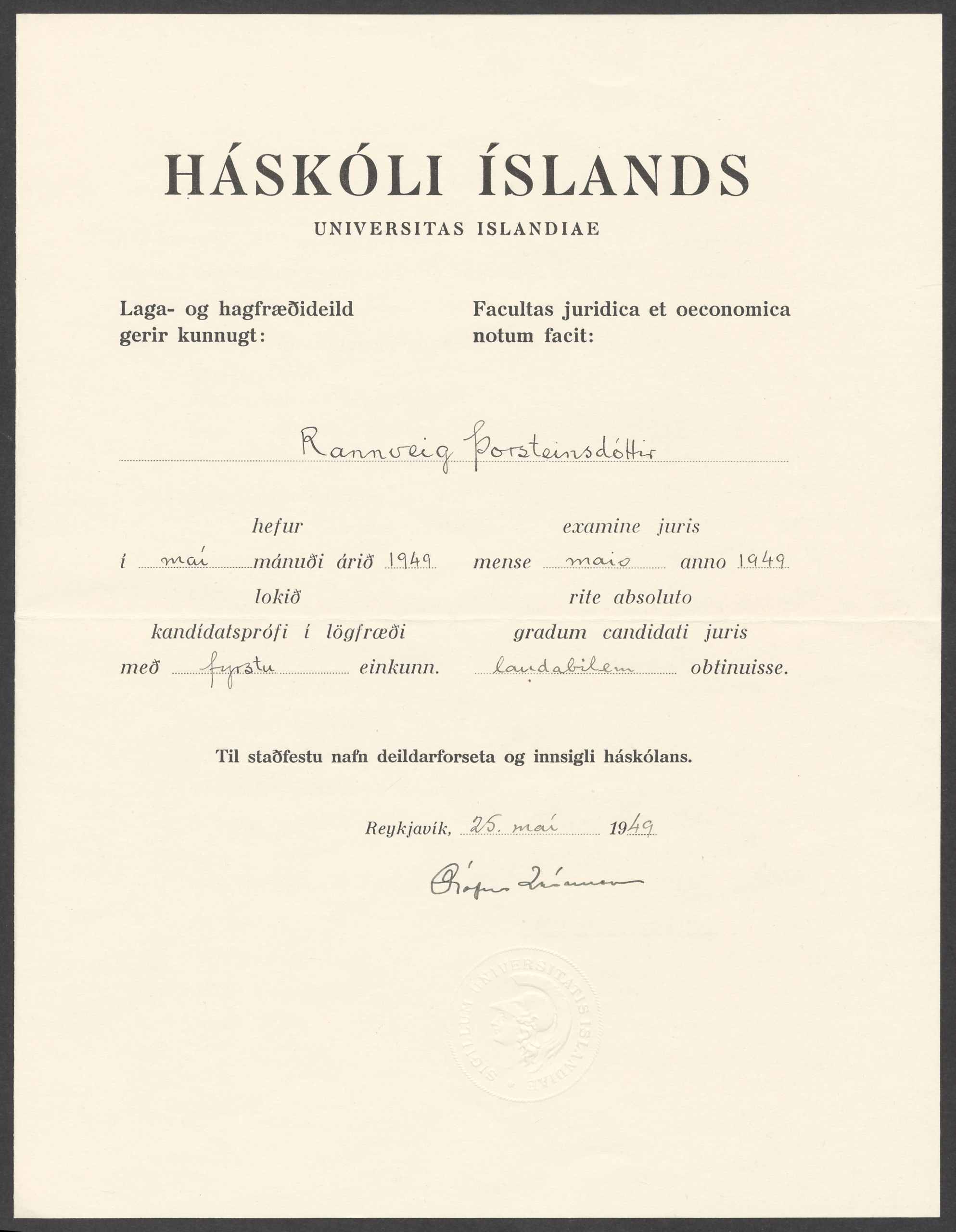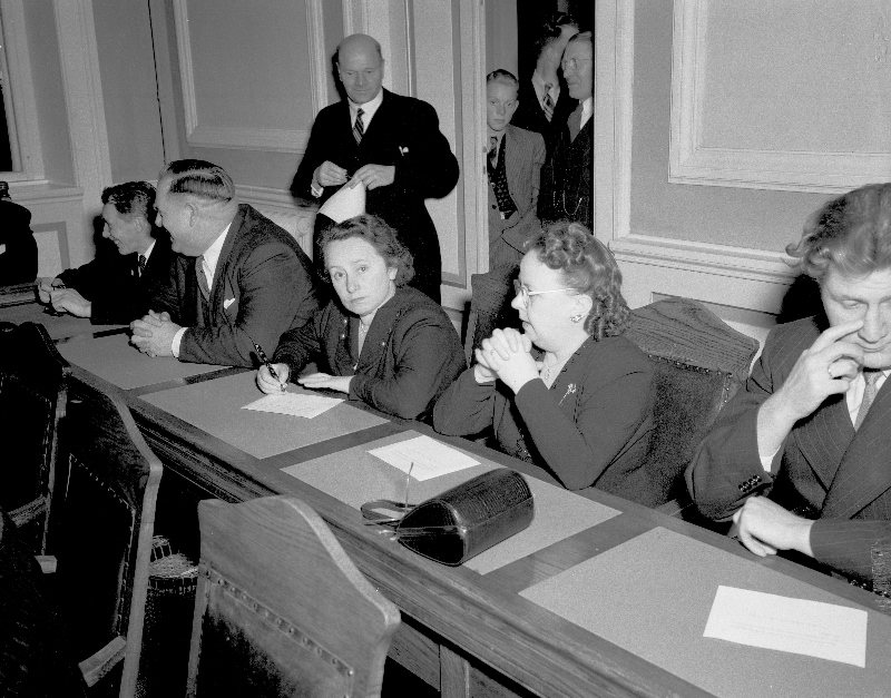 Rannveig Þorsteinsdóttir was born in Mjóifjörður in the east of Iceland, but moved at a young age to Reykjavík and graduataed from the Samvinnuskóli cooperative school. For many years she did office work, including working as a clerk for the newspaper Tíminn, but when she was around forty years old she decided to return to education. In a short time span she graduated from Menntaskólinn in Reykjavík secondary school and then from the law department at the University of Iceland. She founded her own law firm and was the first woman in Iceland to receive a license to practice before the Supreme Court of Iceland. Rannveig sat in parliament for the Progressive Party from 1949 to 1953, and at that time she was one of two women in parliament. She was an active participant in various social activities and was, among other roles, the director of the Federation of Women’s Institutes in Iceland.
